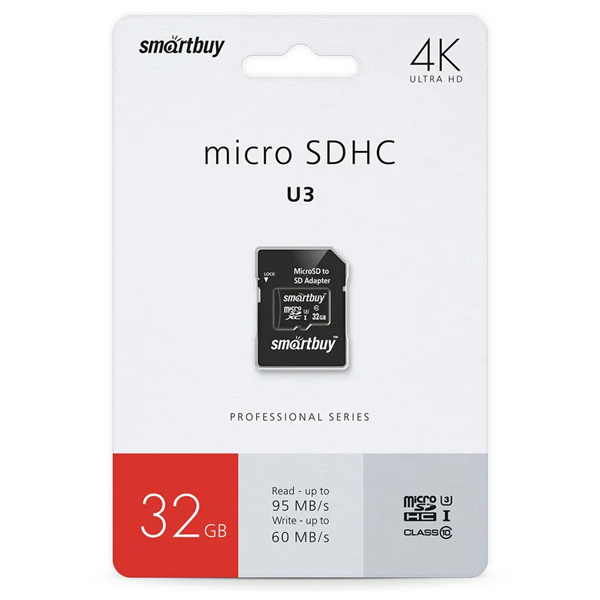 Карта памяти Micro-SD 32Gb Class 10, Smart Buy PRO U3 R/W:95/60 MB/s (с адаптером SD)