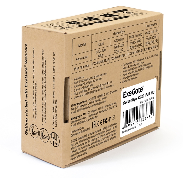 Камера WEB ExeGate GoldenEye C920 Full HD (матрица 1/3" 2 Мп, 1920х1080, 1080P, USB, микрофон с шумоподавлением, универсальное крепление, кабель 1,5 м, Win Vista/7/8/10, Mac OS, черная)