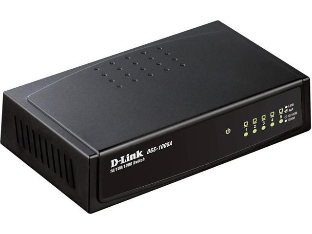 Коммутатор 5TP D-Link DGS-1005A Тип неуправляемый, интерфейсы 5 портов 10/100/1000Мбит/с, коммутационная матрица 10Гбит/с, материал корпуса пластик, блок питания внешний
