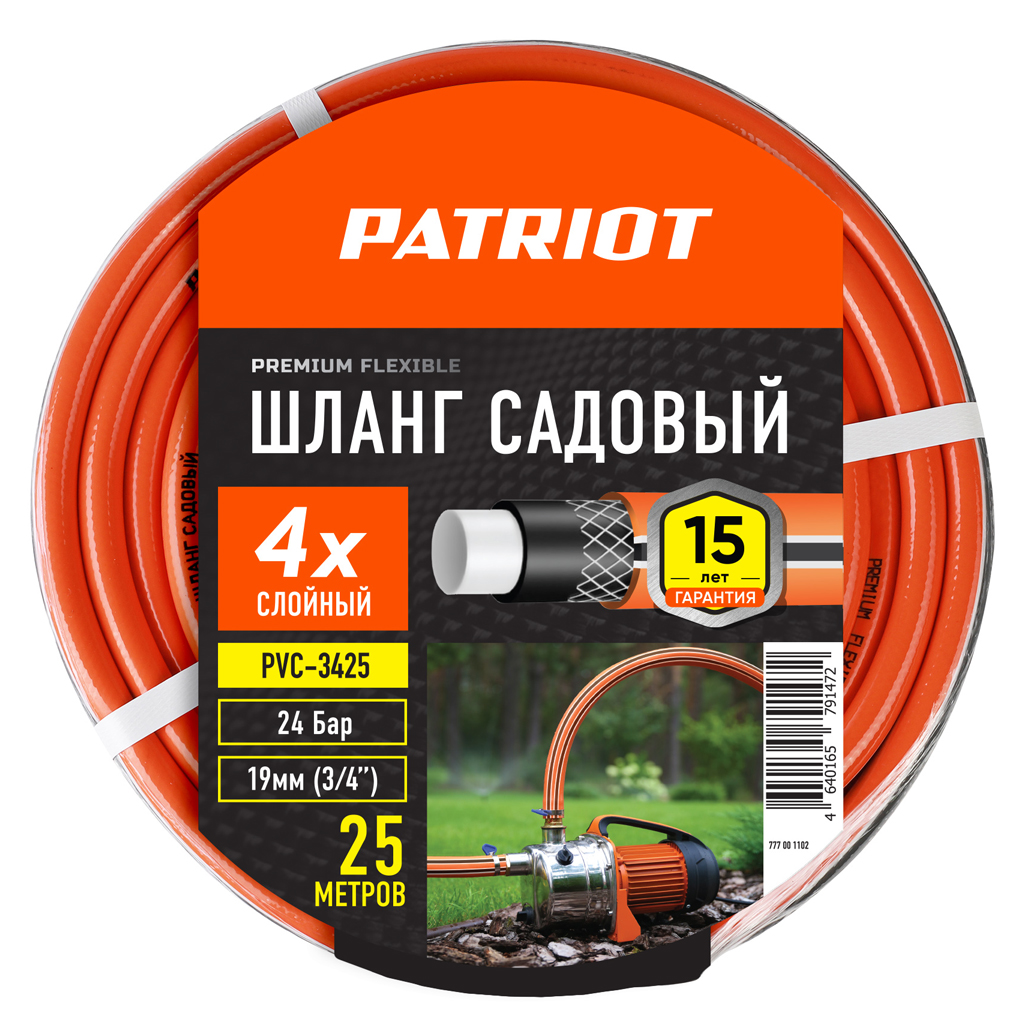 Шланг поливочный, садовый Patriot, PVC-3425, 4слоя, 3/4 ", 25 м, -20-+65гр, бел.внутрен.слой, армированный, гибкий, 8/24бар, против скручивания/перегибов