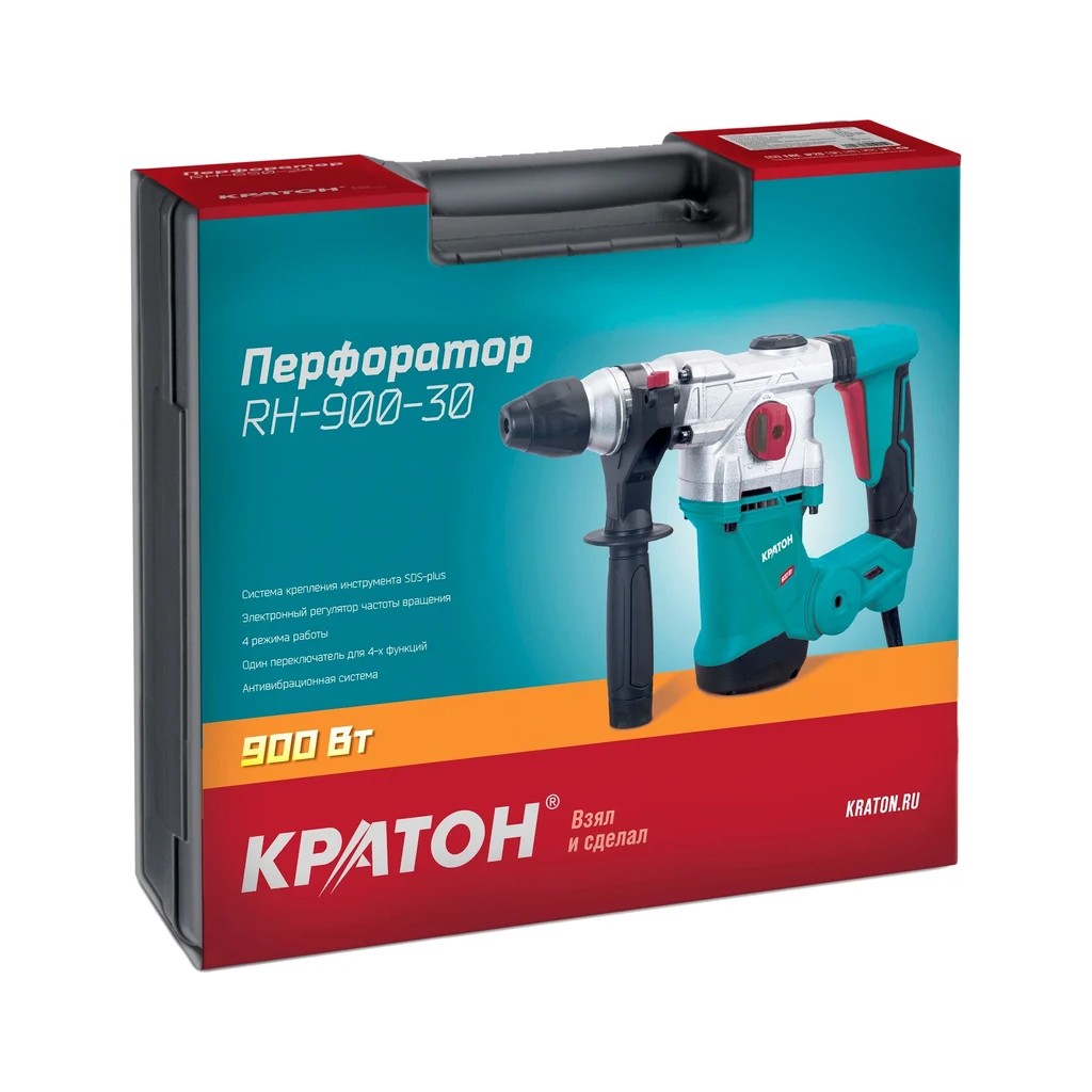 Перфоратор Кратон RH-900-30 патрон SDS-plus 900Вт, уд.:3Дж, 0-850об/мин, 4300уд/мин, бетон-30мм, антивибрационная системак, регулировка частоты вращения, 4,37кг (кейс, набор оснастки)