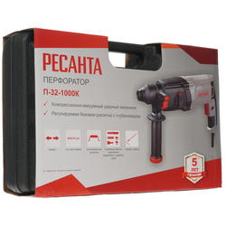 Перфоратор Ресанта П-32-1000К патрон SDS-plus 1000Вт, уд.:5.2Дж, 0-1100об/мин, 4900уд/мин, сталь-13мм, дерево-40мм, бетон-32мм, реверс, регулировка оборотов, 3кг (кейс) 75/3/3