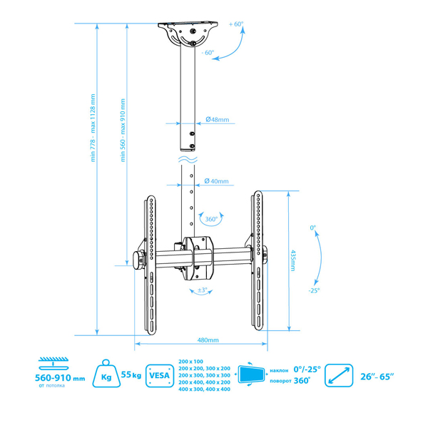 Кронштейн для телевизора Arm Media LCD-1800 черный, 26-65", потолочный, поворот и наклон