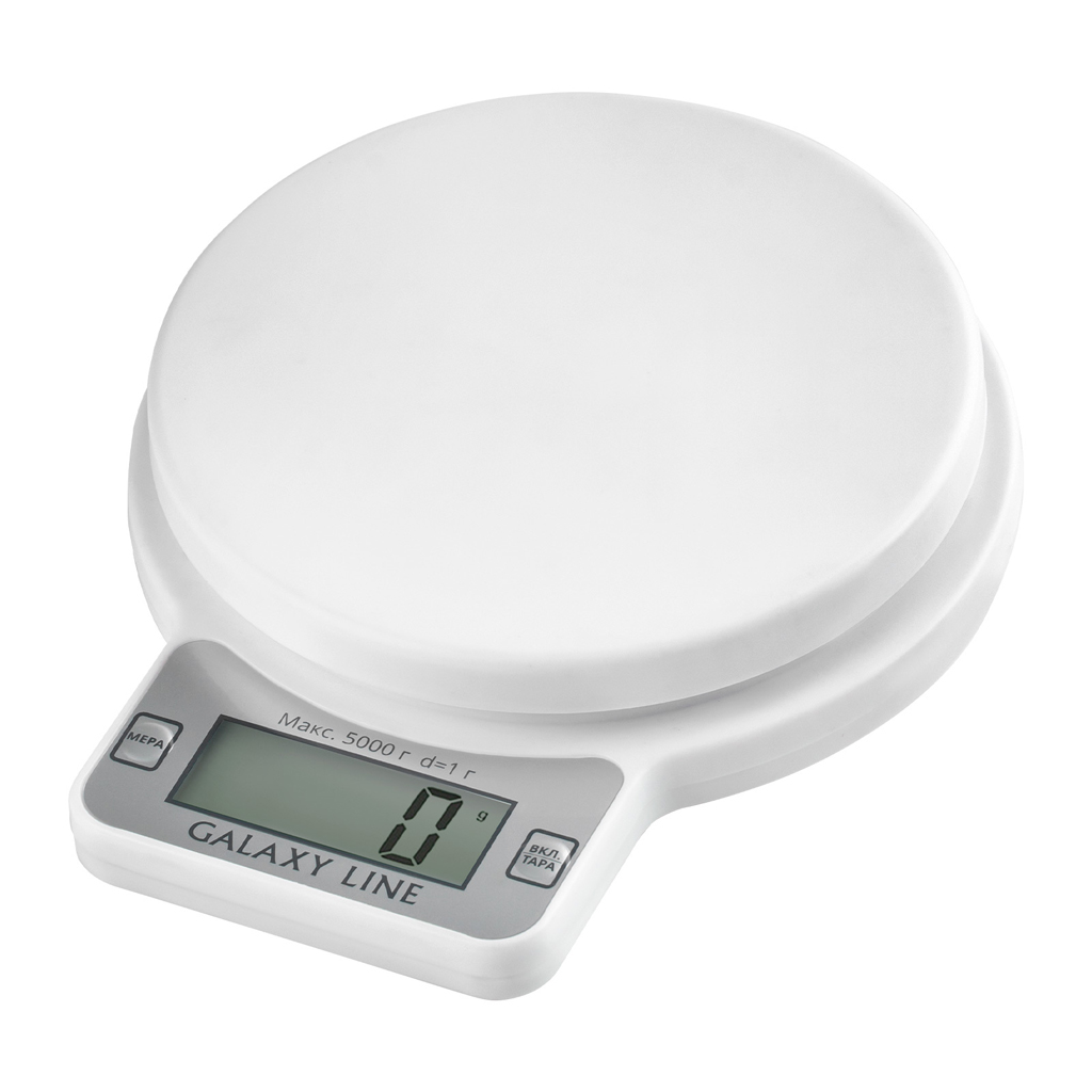 Весы кухонные Galaxy LINE GL 2814 электронные; максимальный вес : 5 кг; цена деления : 1 г; сброс веса тары, автоотключение, источник питания : батарейка CR 2032; материал корпуса : пластик.