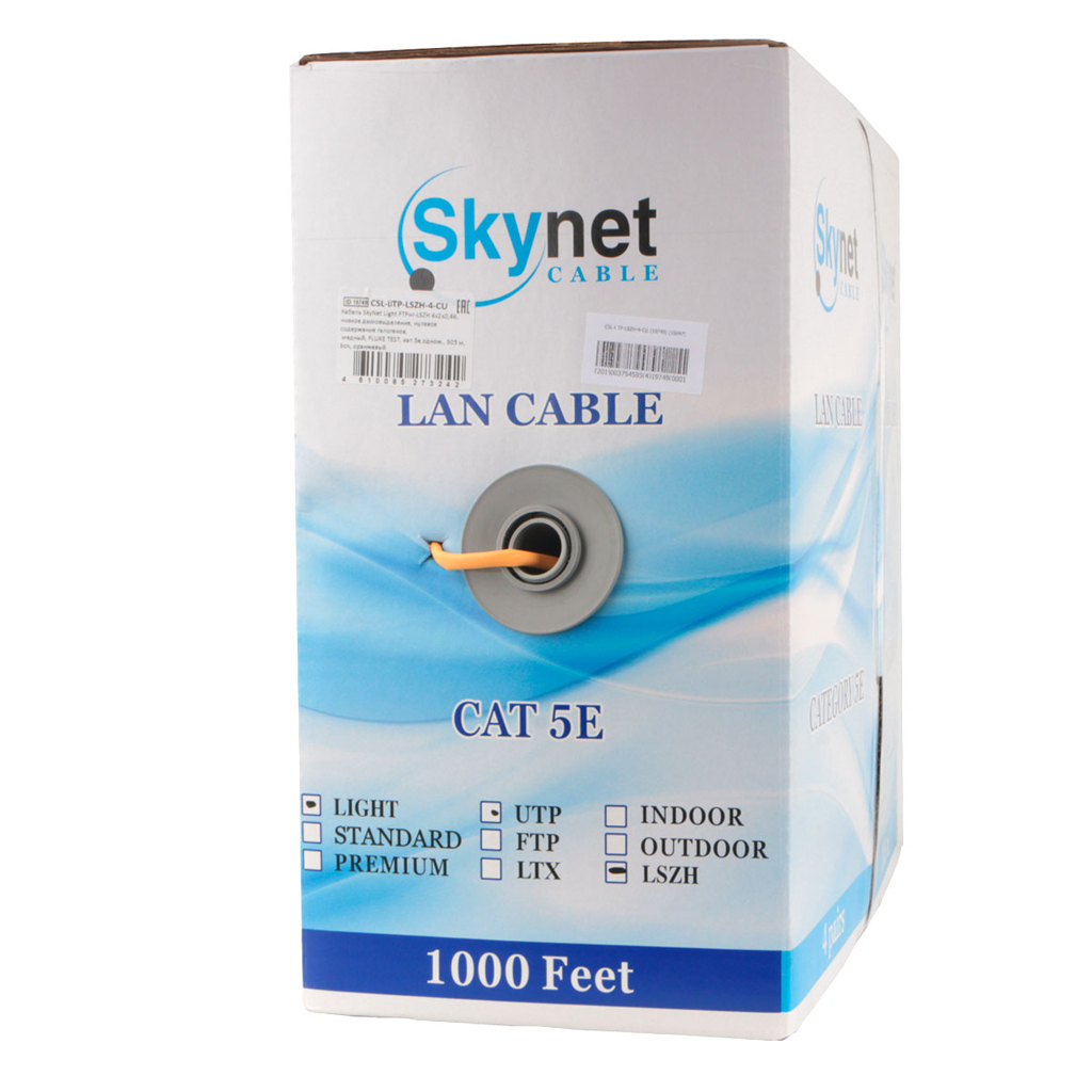 Кабель сетевой бухта SkyNet Light UTPнг-LSZH 4x2x0,46, низкое дымовыделение, нулевое содержание галогенов, медный, FLUKE TEST, кат.5e, однож., 305 м, box, оранжевый