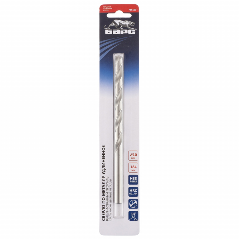 Сверло по металлу 10х184мм сталь Р6М5 удлиненное Барс 718100