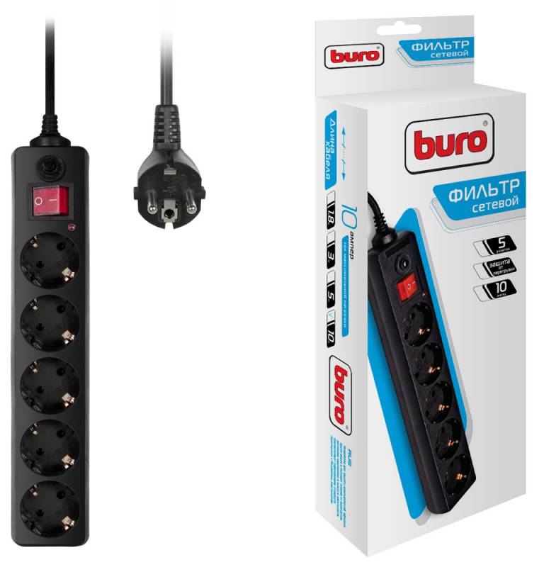 Сетевой фильтр 5 розеток 10.0 м Buro 500SH-10-B черный