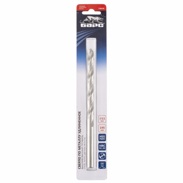 Сверло по металлу 11х195мм сталь Р6М5 удлиненное Барс 718110