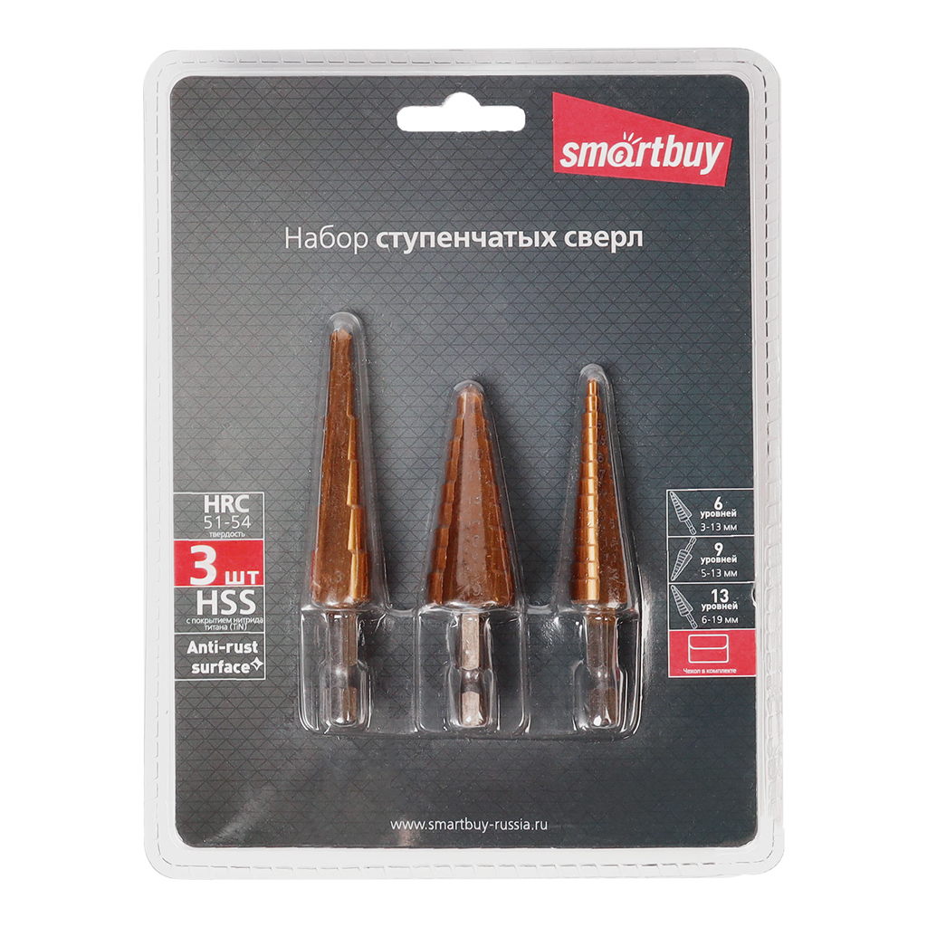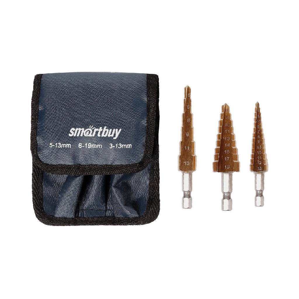 Набор сверл 3 ступенчатых сверл, 1:3-13;2:5-13;3:6-19; сталь HSS, титан.покр, HEX, чехол, Smartbuy