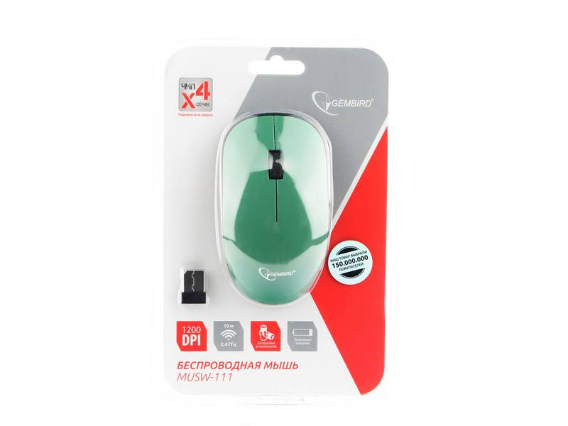 Мышь беспроводная Gembird MUSW-111-GRN, зелёный, 2кн.+колесо-кнопка, 1200DPI, 2.4ГГц