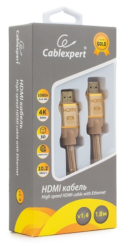 Кабель HDMI Cablexpert CC-G-HDMI03-1.8M серия Gold, 1,8 м, v1.4, M/M, золотой, позол.разъемы, алюминиевый корпус, нейлоновая оплетка, коробка