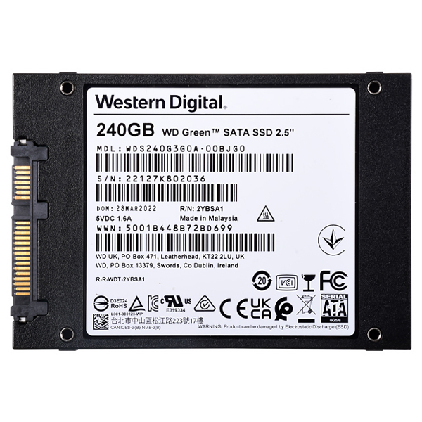 Твердотельный накопитель SSD 2.5" 240Gb WD Green SATA III WDS240G3G0A чтение - 545 Мбайт/сек, запись - 465 Мбайт/сек, 3D NAND 3 бит TLC