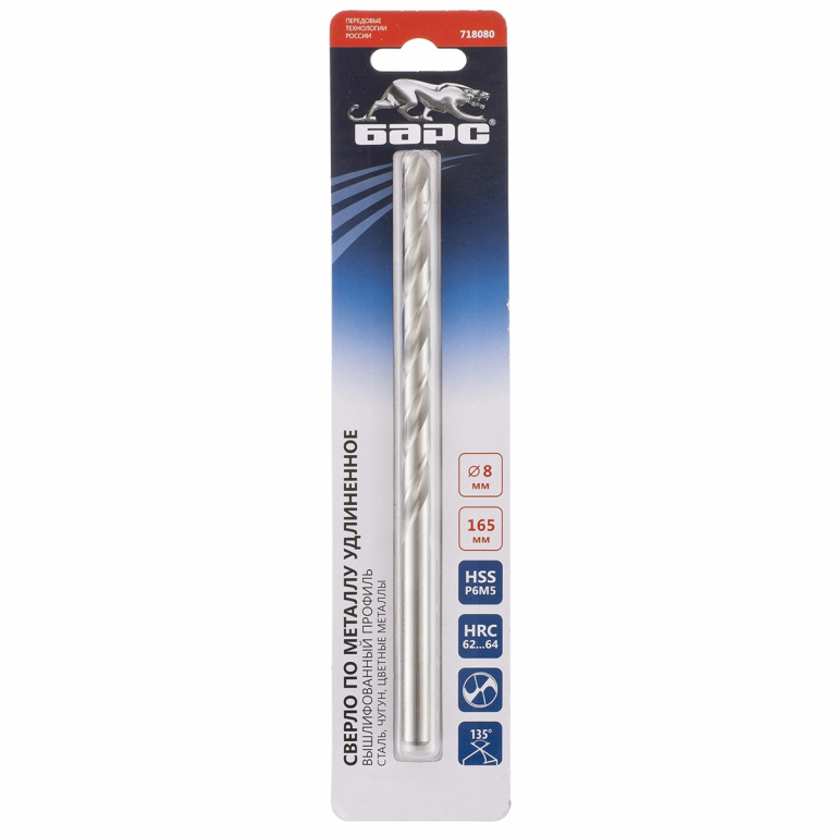 Сверло по металлу 8х165мм сталь Р6М5 удлиненное Барс 718080