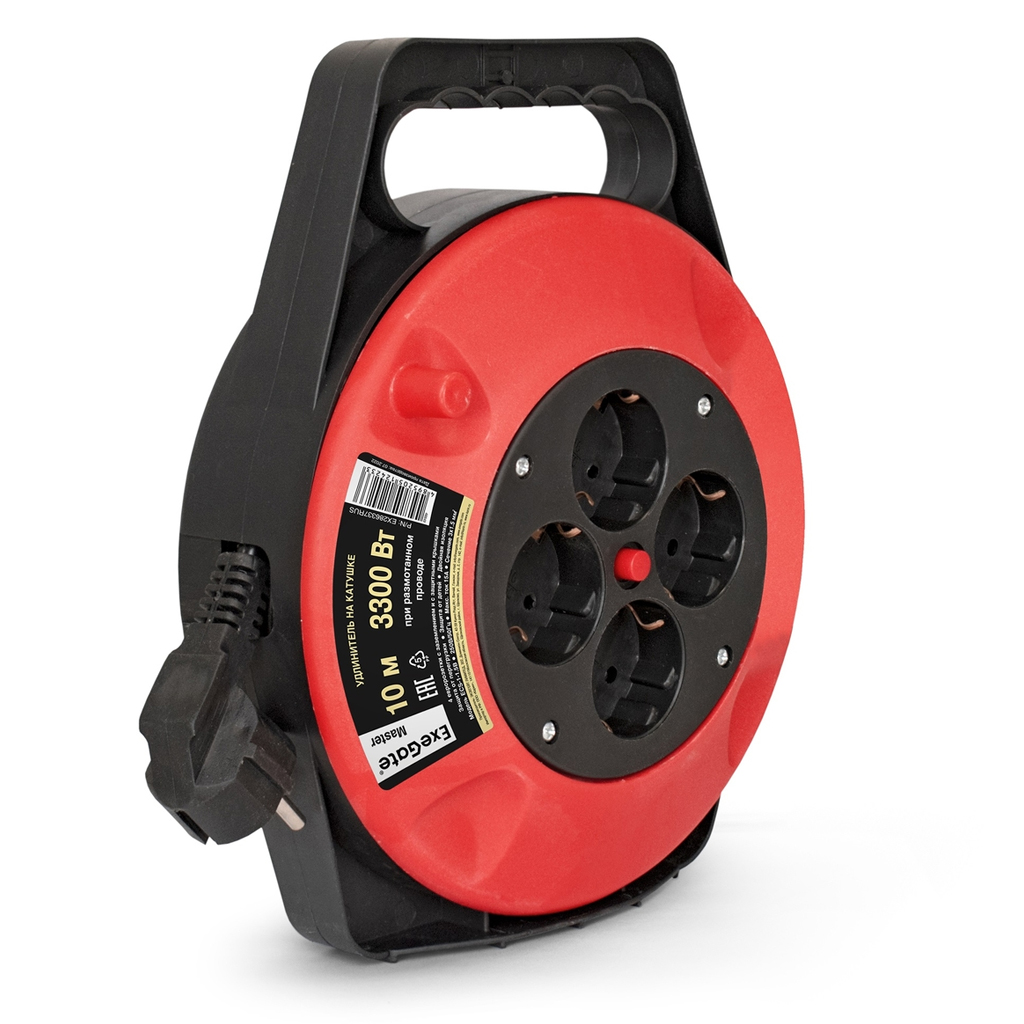 Удлинитель на катушке ExeGate Master ECS-1-1.5B (4 евророзетки с заземлением, 10м, защита от детей, защита от перегрузки, 3х1,5мм2, 15А/3.3кВт, Color Box)