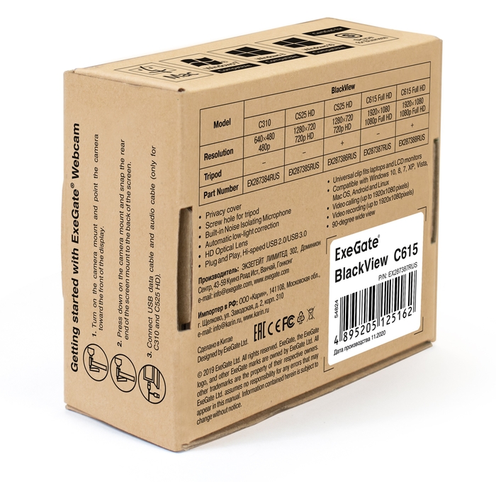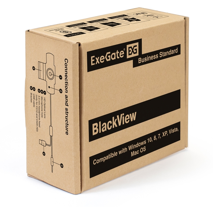 Камера WEB ExeGate BlackView C615 FullHD (матрица 1/3" 2 Мп, 1920х1080, 1080P, 30fps, 4-линзовый объектив, шторка, USB, фиксированный фокус, микрофон с шумоподавлением, универсальное крепление, отверстие под штатив, кабель 1,5 м, Win Vista/7/8/10, Ma