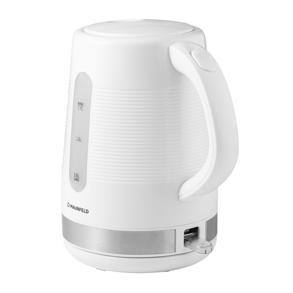 Чайник MAUNFELD MGK-631W объем : 1.7 л; мощность : 2200 Вт; нагревательный элемент : закрытый; автоотключение при отсутствии воды, индикаторы : включения; уровня воды; вращение на 360 гр., материал корпуса : пластик; цвет корпуса : белый.