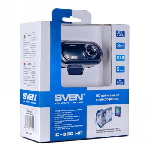 Камера WEB SVEN IC-950 HD 1280х720, 30 кадр/сек, USB2.0, микрофон, настраиваемое фокусное расстояние, шариковый шарнир, угол поворота 360°,автоматическое отслеживание лица