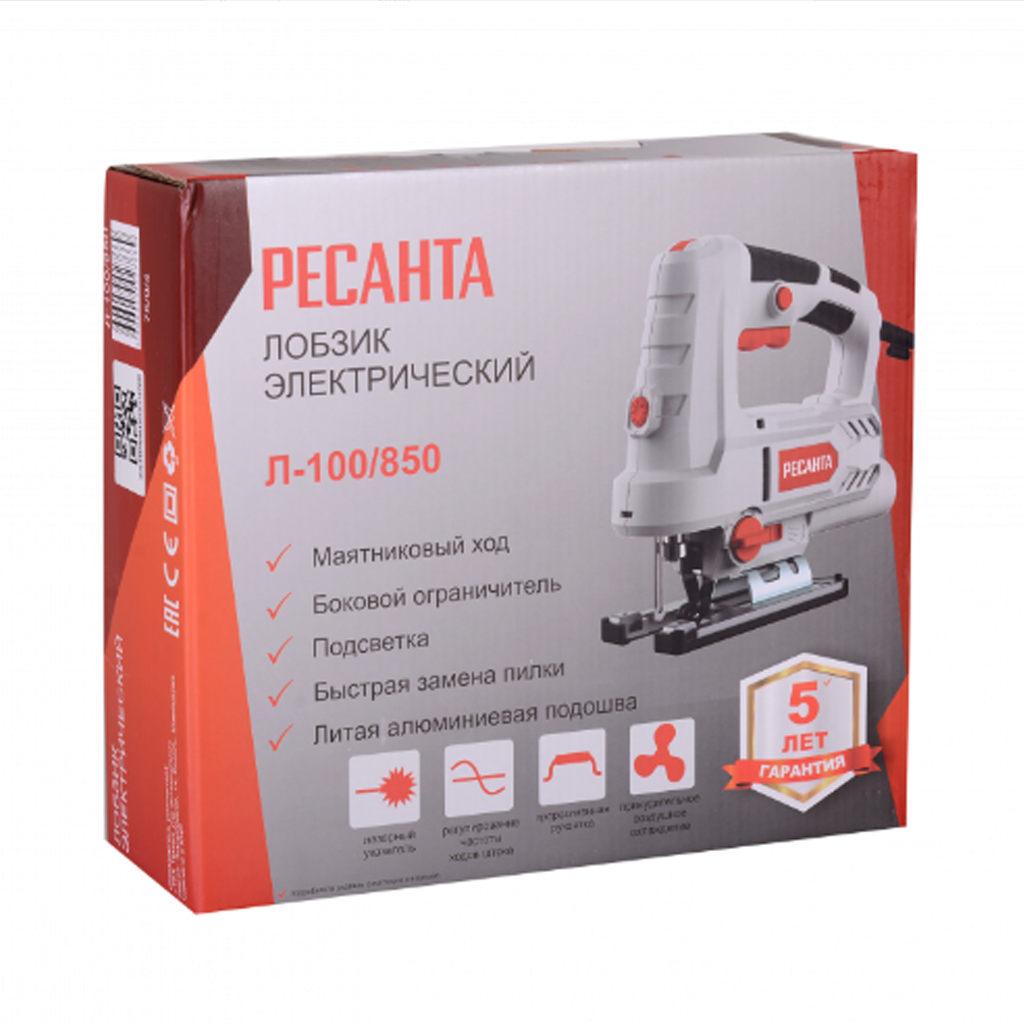Лобзик Ресанта Л-100/850 850Вт, 800-3000 ходов/мин, глубина пропила: сталь-10мм, дерево-100мм, регуляровка частоты хода, лазерный указатель, литая подошва, 2,4кг