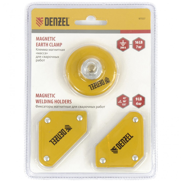 Набор из 2 магнитных сварочных фиксаторов и магнитной клеммы "масса" макс. ток 200А Denzel (97557)