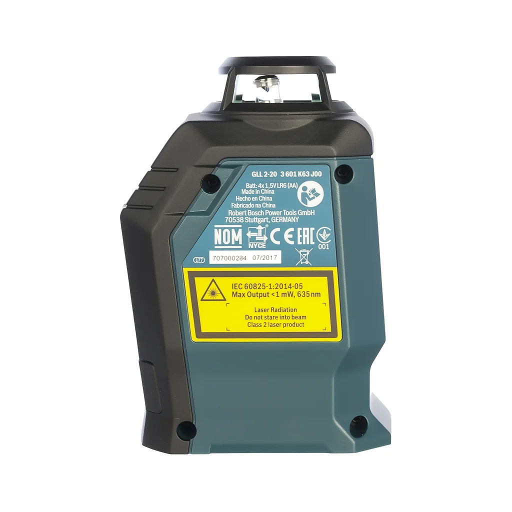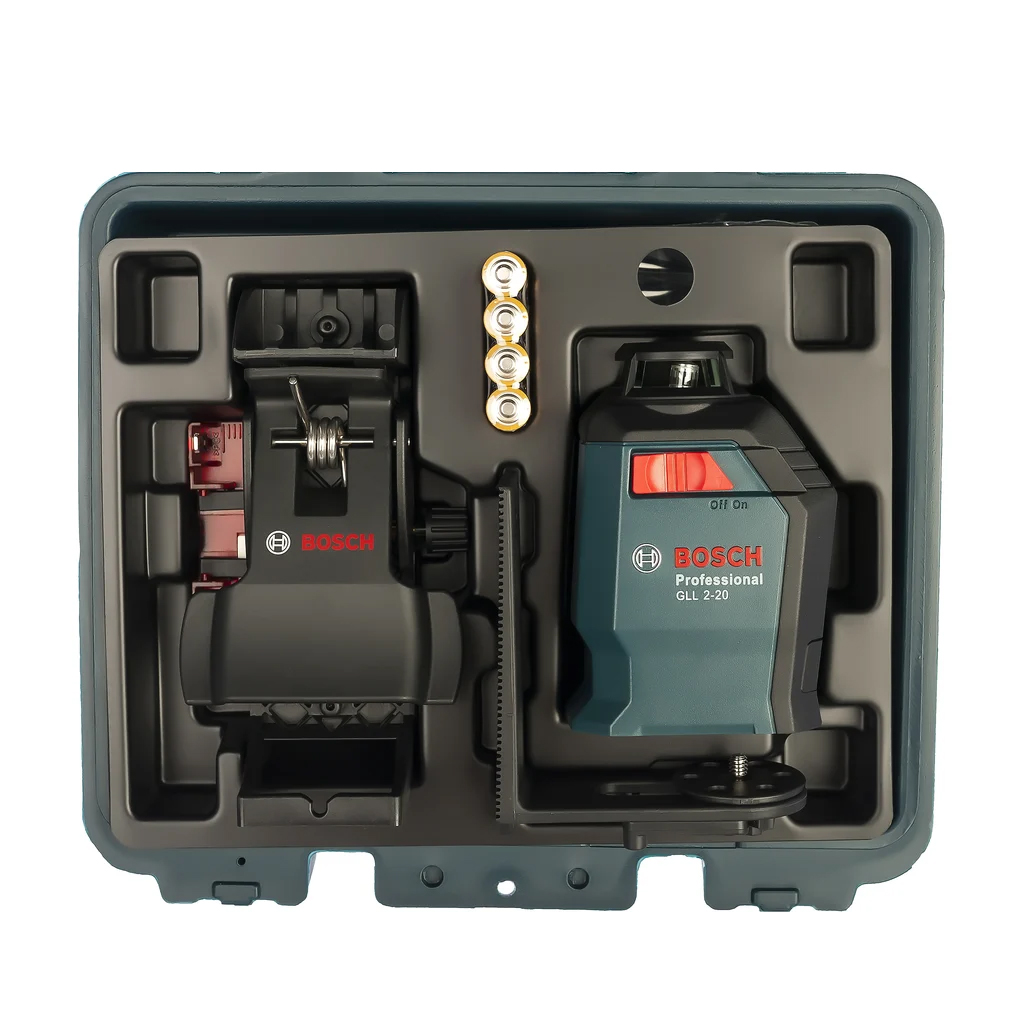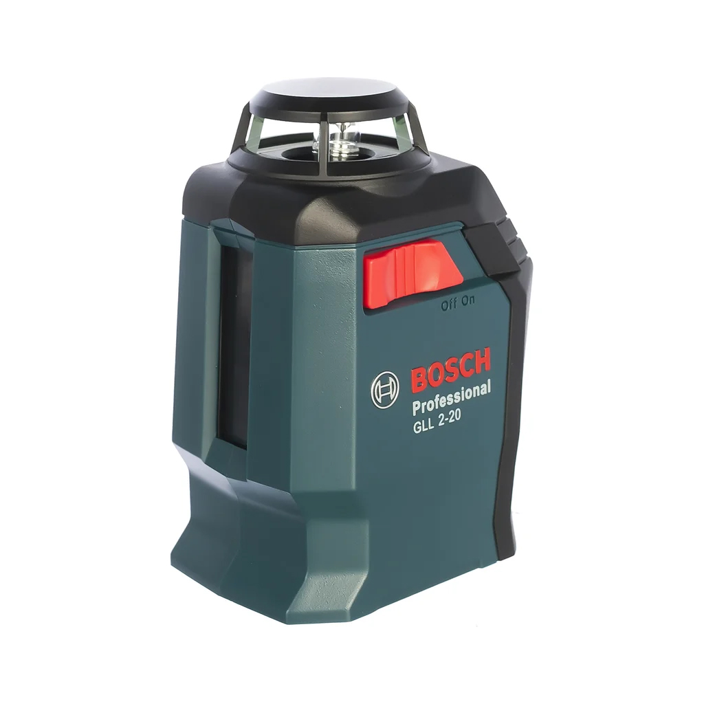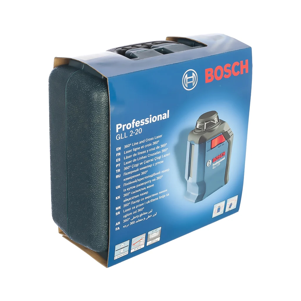 Лазерный нивелир Bosch GLL 2-20 дальность измерения 20м, 360 градусов, красный вертикальный и горизонтальный лучи, крест, 4x1,5-В-LR6 (AA), крепление BM3, лазерный отражатель, кейс (0601063J00)