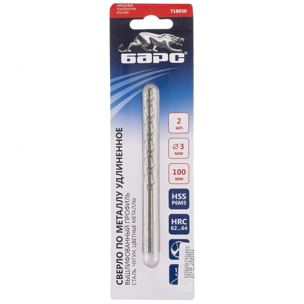 Сверло по металлу 3х100мм сталь Р6М5 удлиненное 2шт/уп Барс 718030