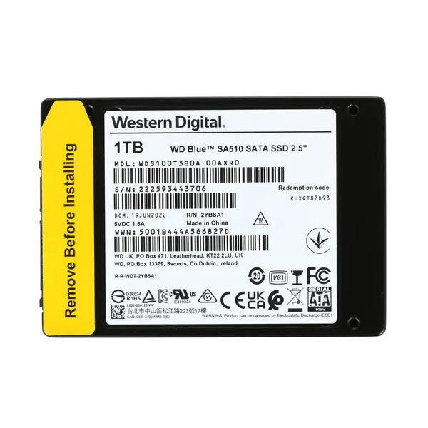 Твердотельный накопитель SSD 2.5" 1Tb WD Blue SA510 WDS100T3B0A SATA, чтение - 560 Мбайт/сек, запись - 520 Мбайт/сек, 3D NAND 3 бит TLC