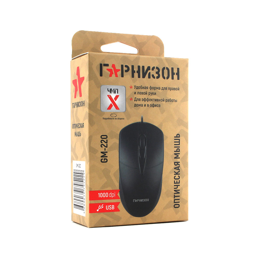 Мышь проводная Гарнизон GM-220XL USB, чип- Х, черный,1000 DPI, 2кн.+колесо-кнопка, кабель 2м