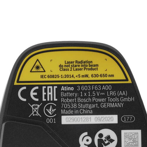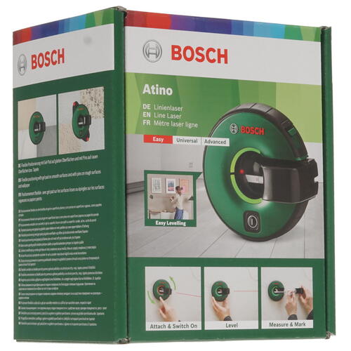 Лазерный нивелир Bosch Atino set линейный, мерная лента, дальность измерения 2м, красный луч, точность 0.3 °, 1x1,5-В-LR6 (AA), гелевые вкладыши для крепления к разным поверхностям (0603663A01)