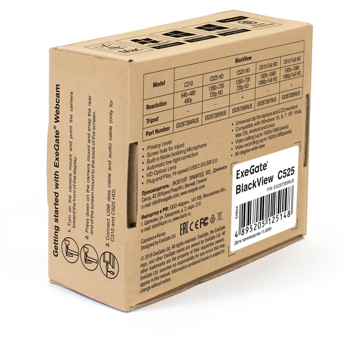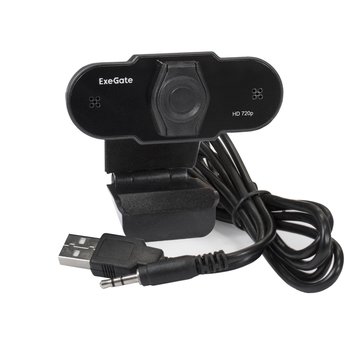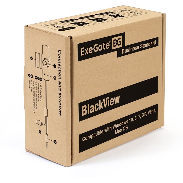 Камера WEB ExeGate BlackView C525 HD (матрица 1/3" 1,3 Мп, 1280х720, 720P, 30fps, 4-линзовый объектив, шторка, USB, фиксированный фокус, микрофон с шумоподавлением, универсальное крепление, отверстие под штатив, кабель 1,5 м, Win Vista/7/8/10, Mac OS