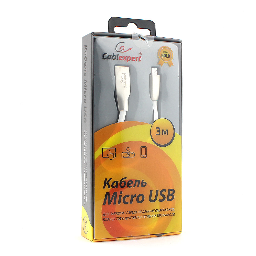 Дата-кабель USB-microUSB Cablexpert CC-G-mUSB01W-3M Длина 3м, Цвет белый, Силиконовый ромбовидный шнур, Интерфейс USB 2.0