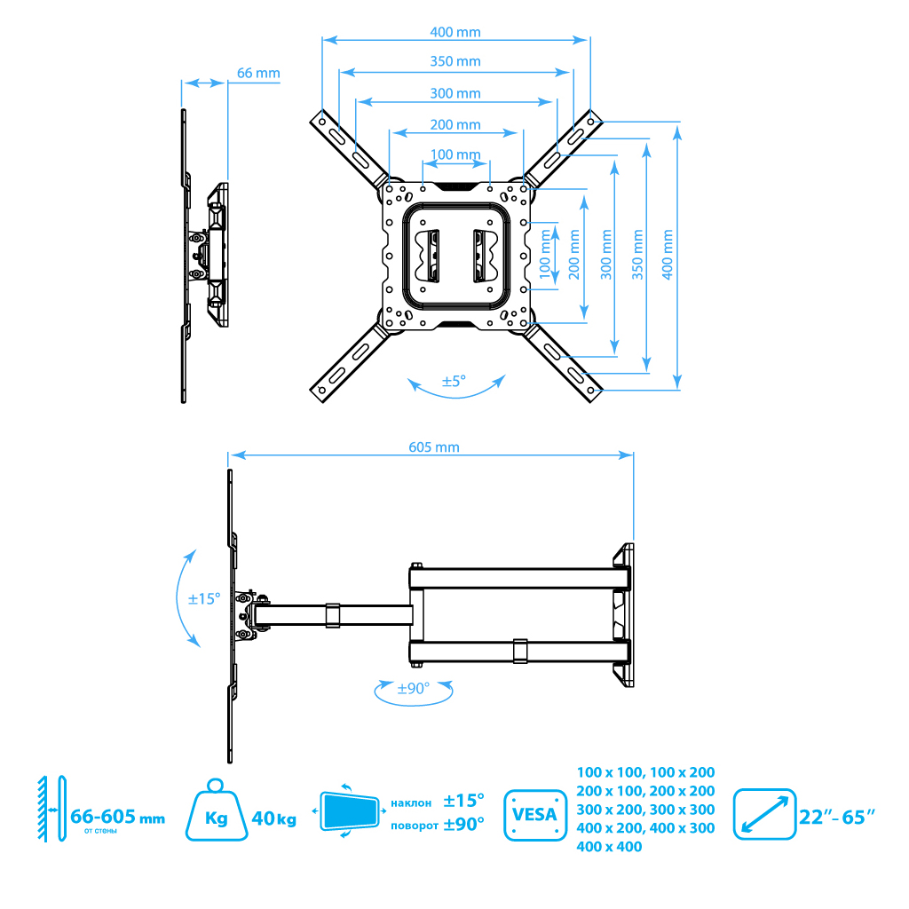 Кронштейн для телевизора Kromax DIX-18 черный 22"-55" макс.40кг настенный поворот и наклон