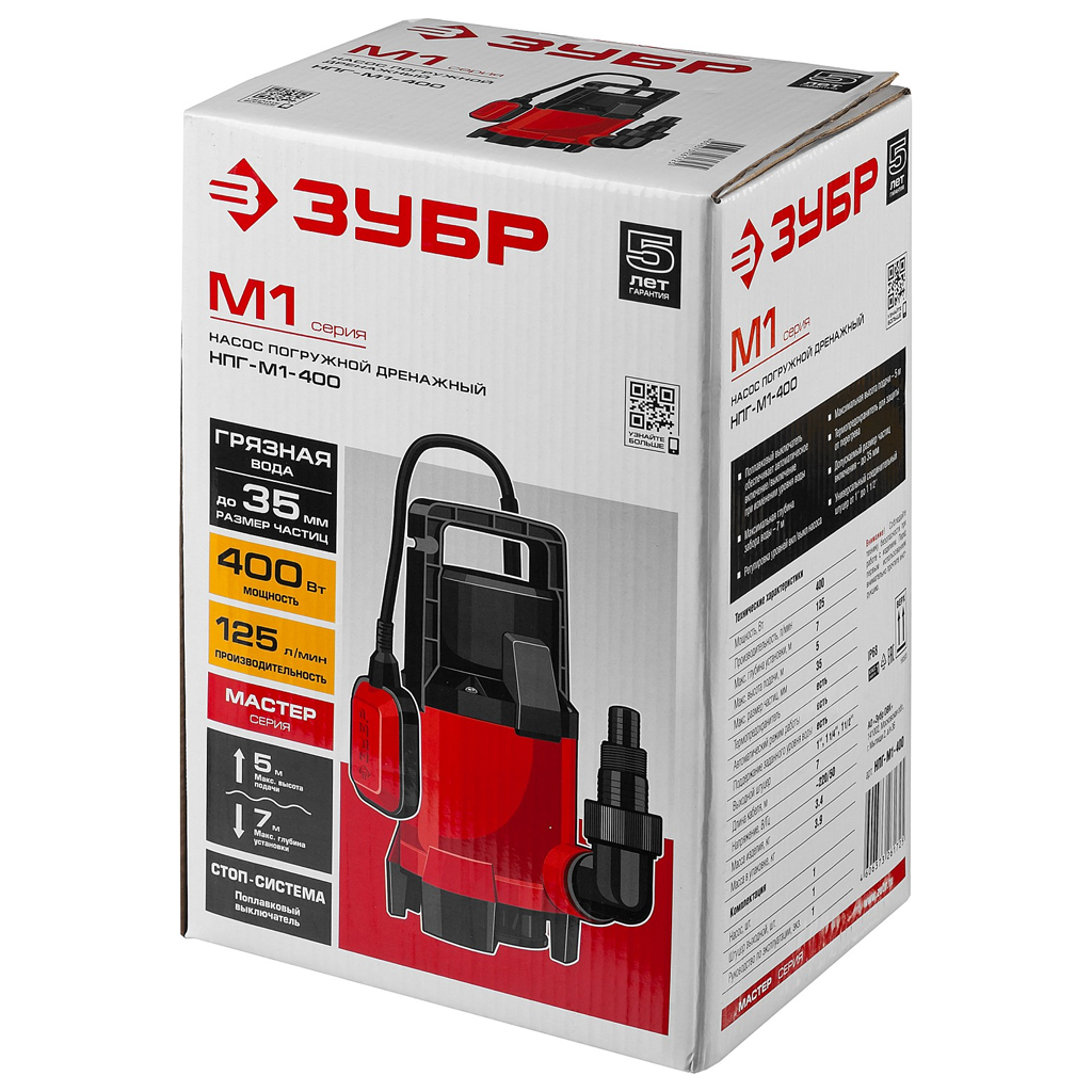 Насос Зубр НПГ-М1-400 дренажный 400Вт, подъем 5м, глубина погружения 7м, 125 л/мин, для грязной воды частицы до 35мм, термопредохранитель