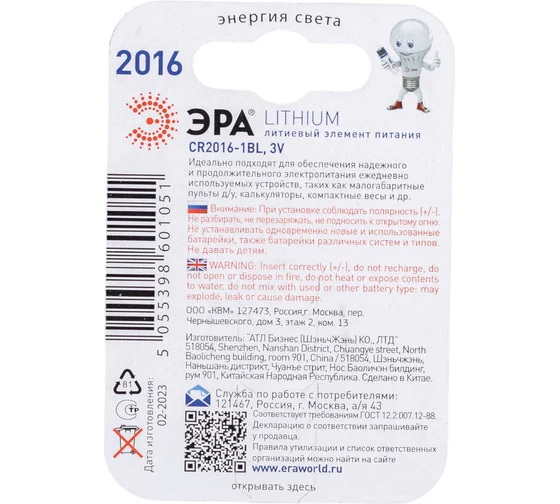 Элемент питания 2016 для материнских плат 1BL ЭРА
