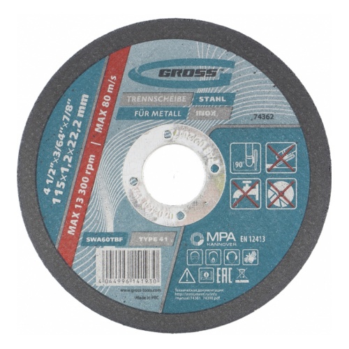 Круг отрезной 115х1,2х22,2мм по металлу + нерж. Gross 74362