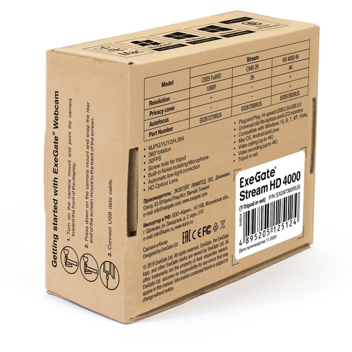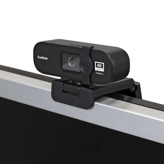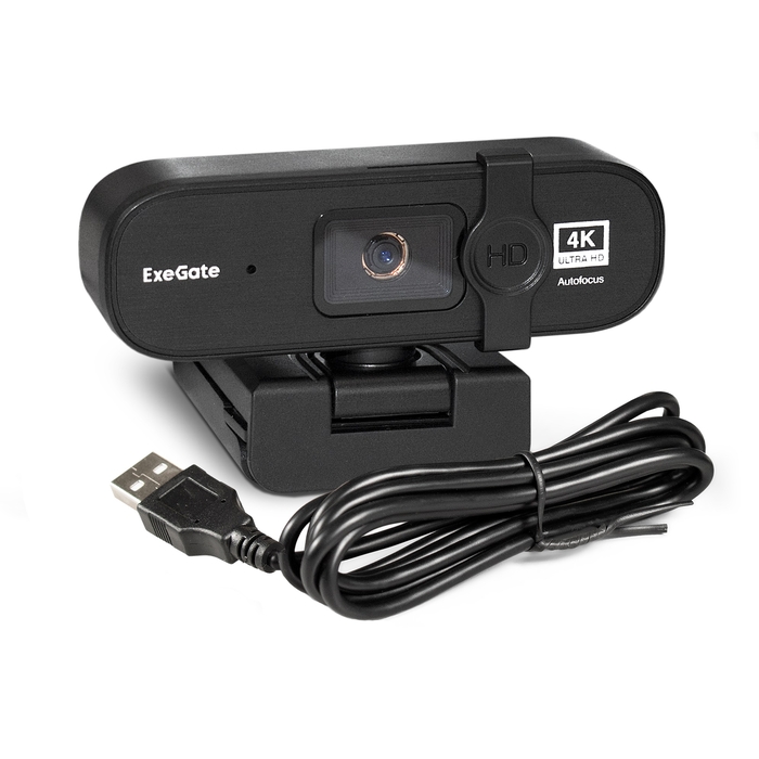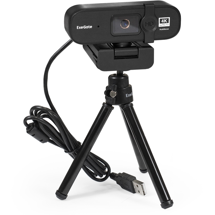 Камера WEB ExeGate Stream HD 4000 4K UHD T-Tripod (матрица 1/3" 8 Мп, 3840x2160, 32fps, 6-линзовый объектив (стекло), автофокус, шторка, USB, микрофон с шумоподавлением, телескоп штатив Tripod Tele Ball, кабель 1,5 м,