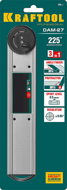 Угломер электронный Kraftool DAM-27 50 мм, диапазон 0-225°, точность ±0,05°, функция HOLD, пузырьковый уровень, фиксация угла, выбор позиции нуля (34684)