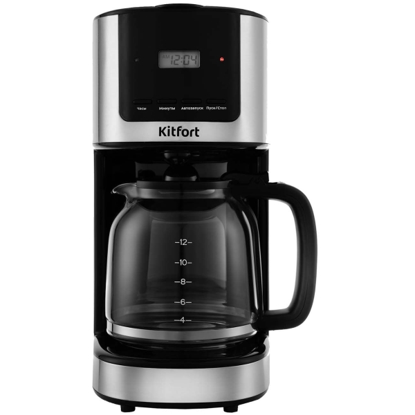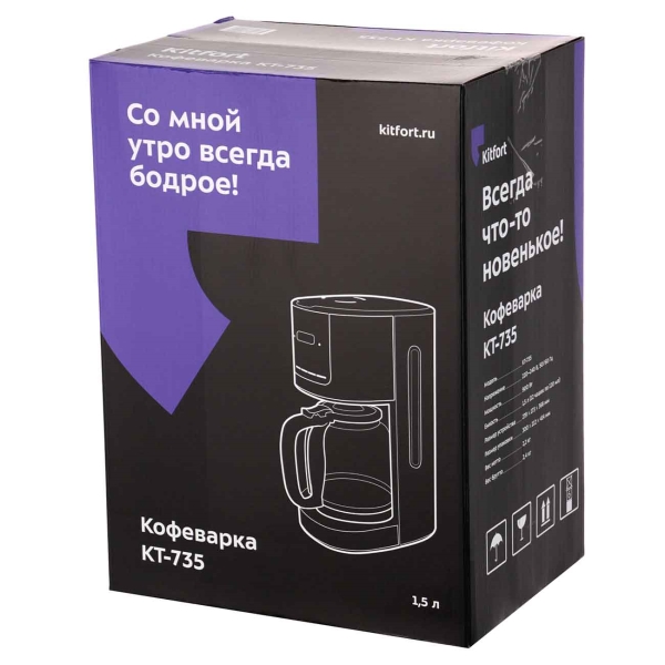 Кофеварка капельная Kitfort KT-735 мощность : 900 Вт; объем резервуара для воды : 1.5 л; объем резервуара для воды : 12 чашек, тип используемого кофе : молотый; противокапельная система, дисплей, поддержание температуры готового напитка.
