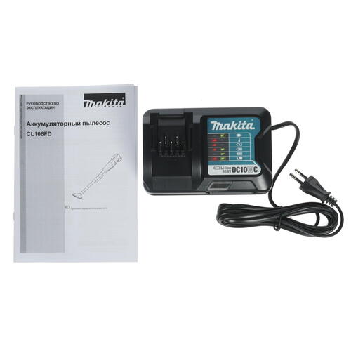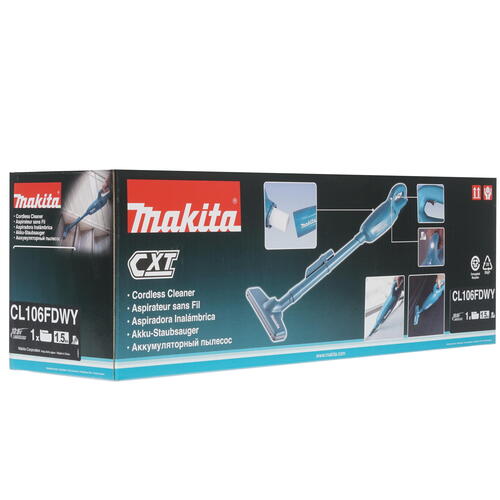 Пылесос строительный Makita CL106FDWY аккуммуляторный Цвет зеленый, питание 10.8В, аккумулятор Li-Ion 1.5Ah, разряжение воздуха 31мБар, расход воздуха 21л/с, сухая и влажная уборка, контейнер 0.6л, класс пыли L