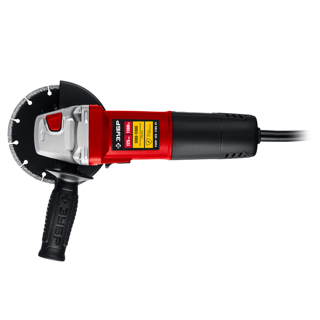 Шлифовальная машина Зубр УШМ-П125-1105 ЭТ угловая 1100Вт, диск 125мм, 3000-11000 об/мин, эл, регулировка оборотов, кнопка фиксации пуска, 2кг