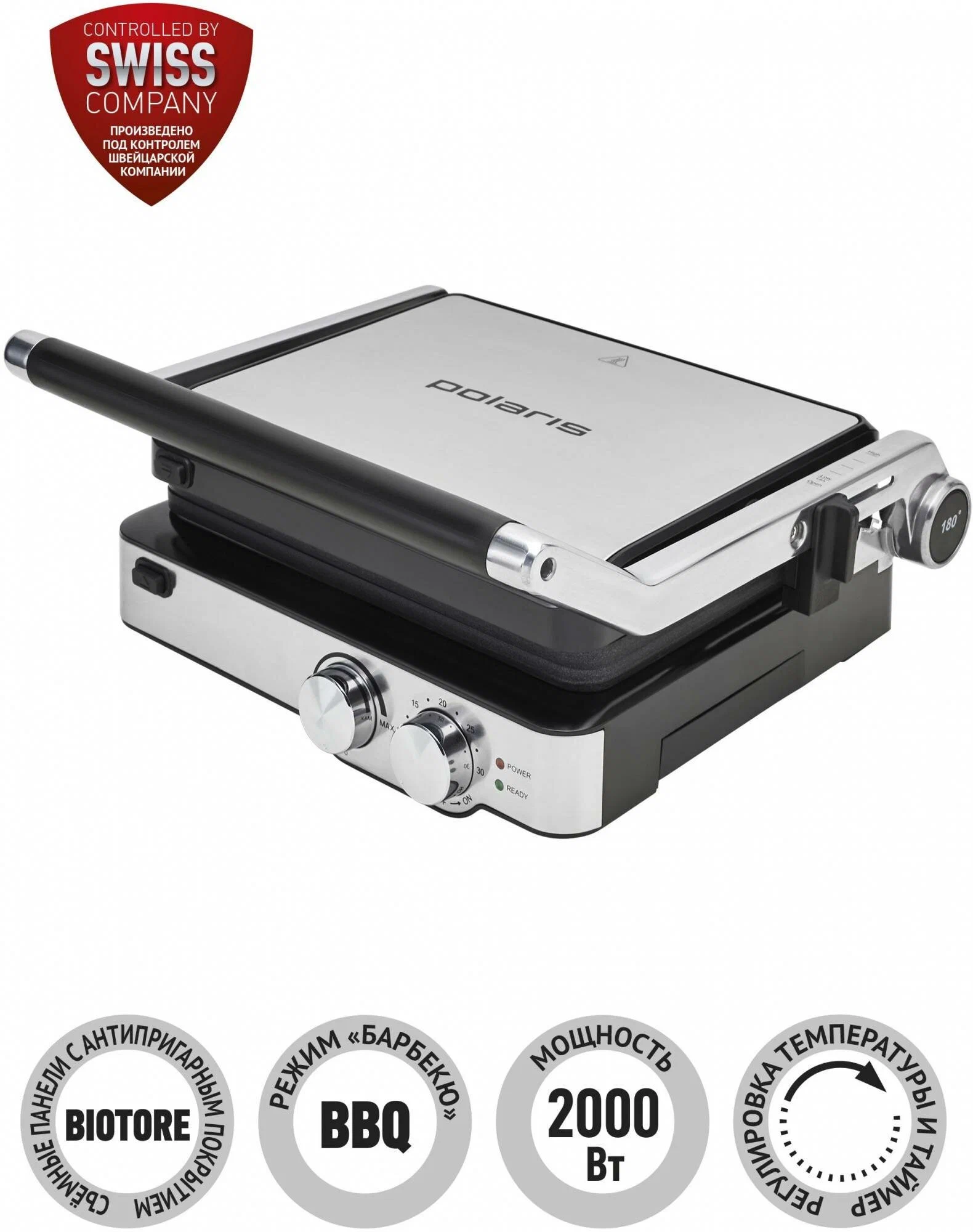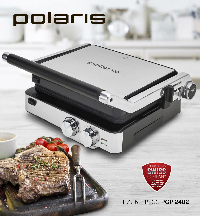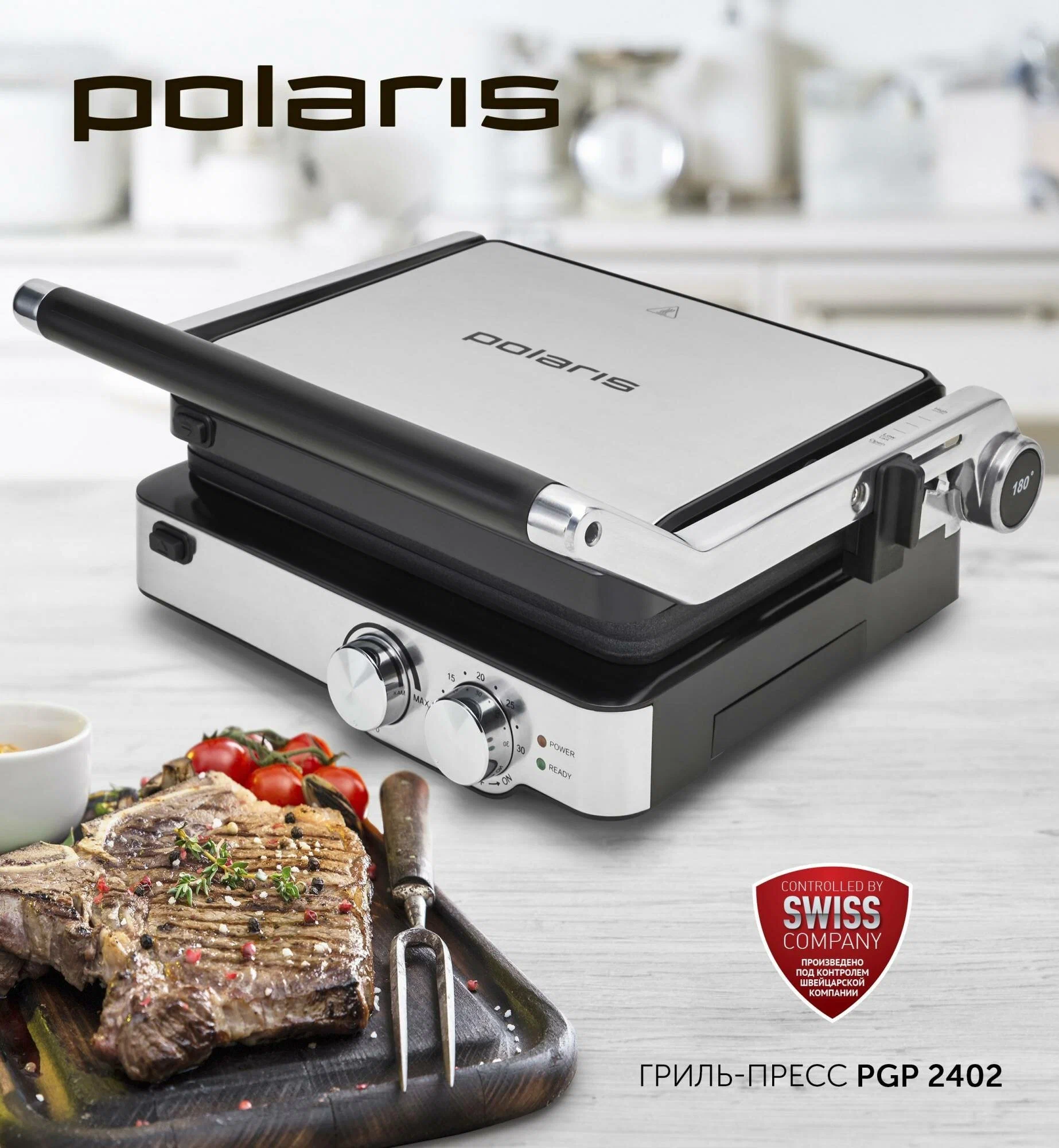 Гриль Polaris PGP 2402 мощность : 2000 Вт; вид : закрытый; покрытие рабочей поверхности : антипригарное; размер рабочей поверхности : 29 см х 23 см; управление : механическое; таймер : съемные панели, комплект : 2 съемные панели; поддон для жира;