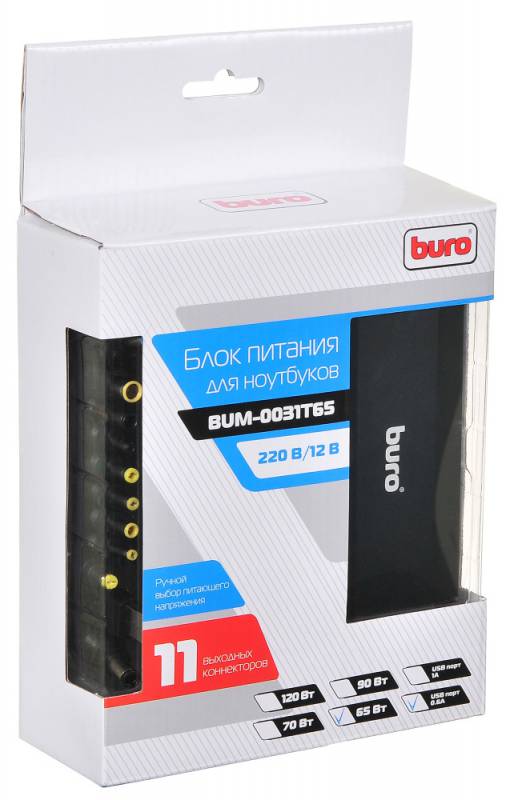 Адаптер для ноутбука универсальный 12V 65Вт Buro BUM-0031T65 ручной 12V-24V 11-connectors 3.2A 1xUSB 0.6A от бытовой электросети черный