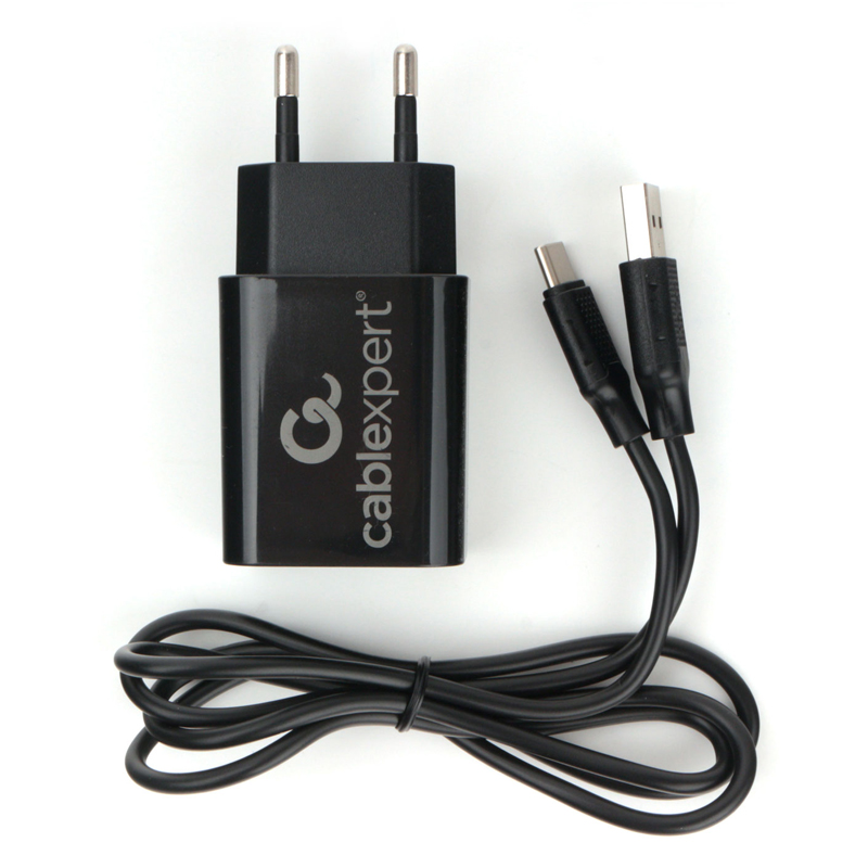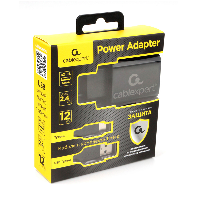 Зарядное устройство сетевое 2хUSB 2.4A Cablexpert MP3A-PC-37 черный + кабель 1м Type-C