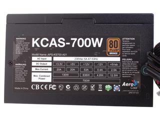 Блок питания 700Вт Aerocool KCAS-700W bronze, ATX, стандарт 80+ gold, питание МП (24+4+4pin), 7xSATA, размер вентилятора 120мм.