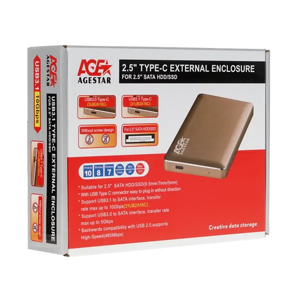 Контейнер HDD внешний AgeStar USB 3.1 Внешний корпус 2,5" SATA AgeStar 31UB2A16C (GOLD), Type-C, алюминий, золотой