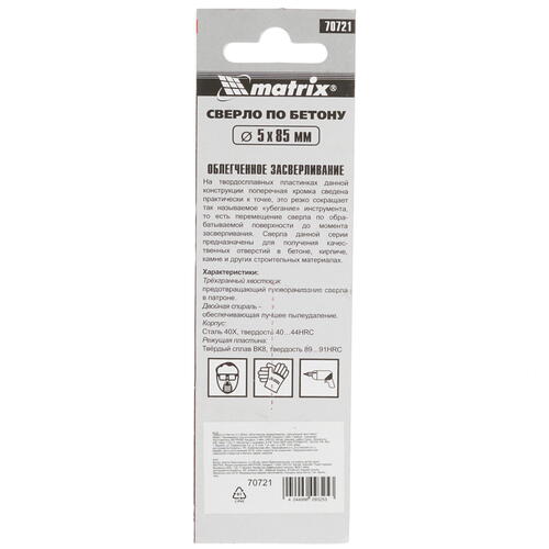 Сверло по бетону 5х85мм 3-гранный хвостовик, облегченное засверливание 70721