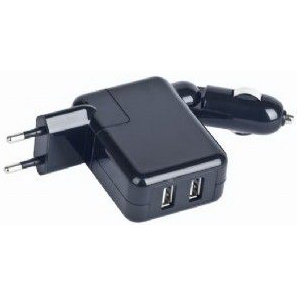 Зарядное устройство сетевое 2хUSB 2.1A, Gembird MP3A-UC-ACCAR2 220V-5V+12V-5V Два USB по 2А черный, дом/автомобиль