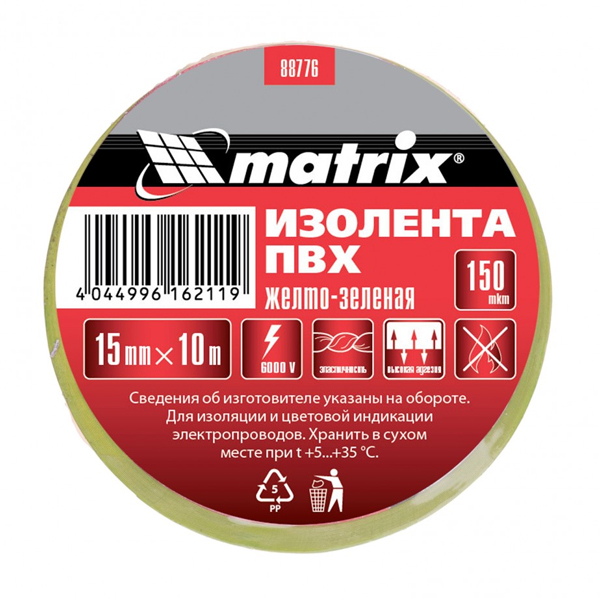 Изолента 15мм х 10м ПВХ 0,15мм желто-зеленая Matrix 88776