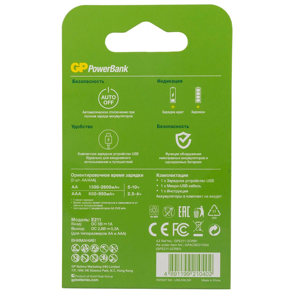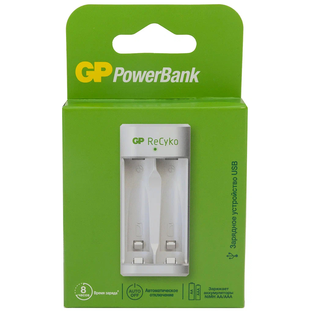 Зарядное устройство AA/AAA GP Recyko E211-2CRB1 GP E211-2CRB1 для 2х аккумов, , отключение при полном заряде