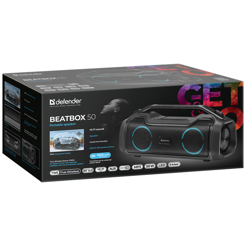 Колонка Bluetooth Defender BEATBOX 50 50Вт, BT/RGB/ TF/TypeC/IPX5/PWB