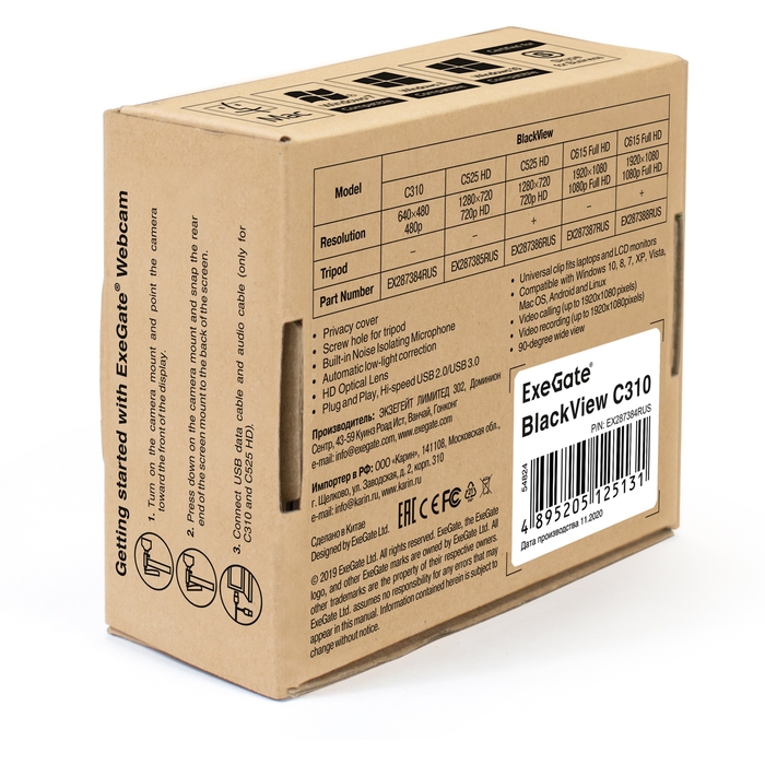 Камера WEB ExeGate BlackView C310 (матрица 1/3" 0,3 Мп, 640х480, 480P, шторка, USB, фиксированный фокус, микрофон с шумоподавлением, универсальное крепление, отверстие под штатив, кабель 1,5 м, Win )